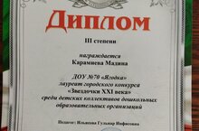 26 января в Городском доме детского творчества №1 прошел финальный концерт городского конкурса среди детских коллективов дошкольных образовавтельных организаций "Звездочки XXI века". Наша воспитанница, Карамева Мадина, стала Лауреатом III степени. Поздравляем победительницу за такой высокий результат!!! Так держать!!!