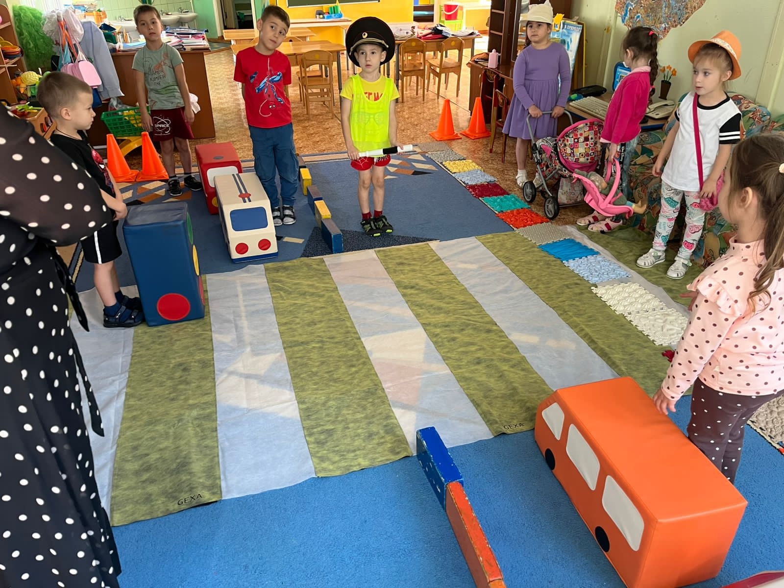 Сегодня в логопедической группе 6 воспитанники обыгрывали ситуации на проезжей части: переход через дорогу на разрешающий сигнал светофора, нельзя отвлекаться на разговоры по телефону, посмотреть на лево и на право.