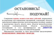 - Совершение взрыва, поджога или иных действий, направленных на разрушение или повреждение предприятий, сооружений, объектов транспортной инфраструктуры (в т.ч. железнодорожных релейных шкафов) и транспортных средств, средств связи (в т.ч. вышек сотовой связи), объектов жизнеобеспечения населения (в т.ч. электроподстанций, объектов водоснабжения, газоснабжения и т.п.) квалифицируется как диверсия по ст. 281 Уголовного кодекса Российской Федерации.