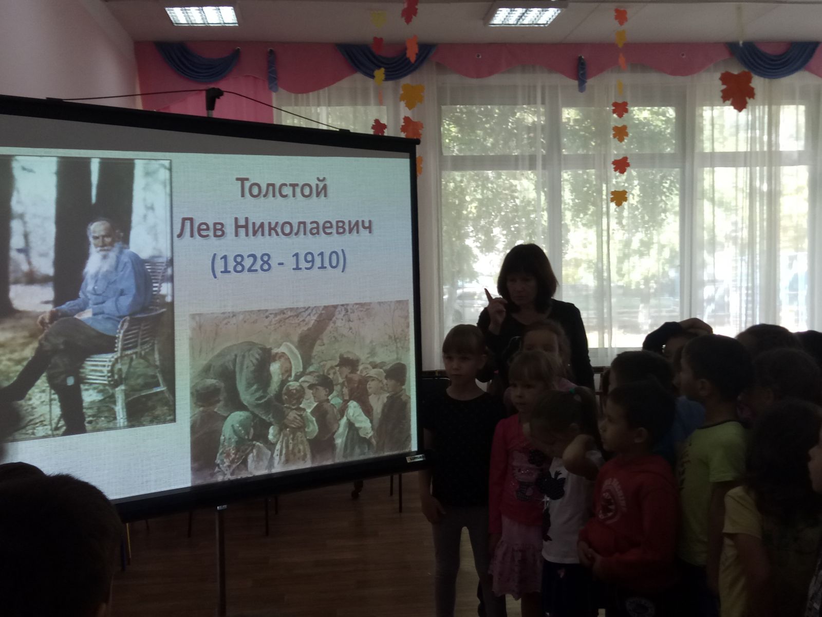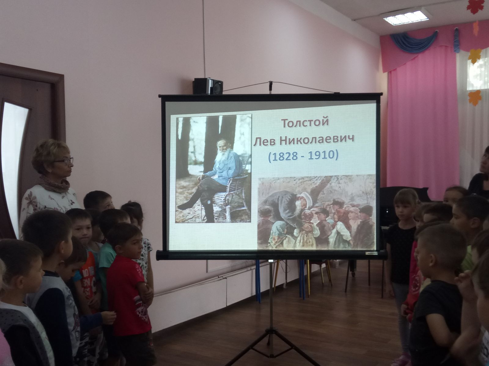 В старших и подготовительных к школе группах прошёли просмотр презентации о жизни и творчестве Л. Н. Толстого, чтение сказок, былин, басен, рассказов о животных и растениях, «Филипок», «Азбука», «О людях, больших и маленьких», «Летучая мышь», «Липунюшка», « Лисица и журавль».