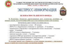 В текущем году (по состоянию на 18 января 2021 года) на территории Республики Татарстан погибло 2 детей, 5 детей получили травмы различной степени тяжести. 17.01.2021 года произошел пожар в одном из домов по ул.Лазурная д.Пятидворье Верхнеуслонского района, в результате которого погибло 4 людей из них 2 детей - 9 и 12 лет. Мужчина 1953 года рождения приехал в жилой загородный дом вместе с зятем и двумя внуками с целью отогрева системы отопления и восстановления теплоснабжения. Причина пожара выясняется, ведется дознание. 04.01.2021 года в результате пожара по ул.Боевая г.Казани получили травму двое детей 4 лет.