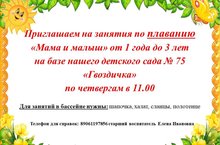 На базе МБДОУ "Детский сад № 75 "Гвоздичка" организуются занятия по плаванию для детей от 1 года до 3 лет, не посещающих детский сад!!!