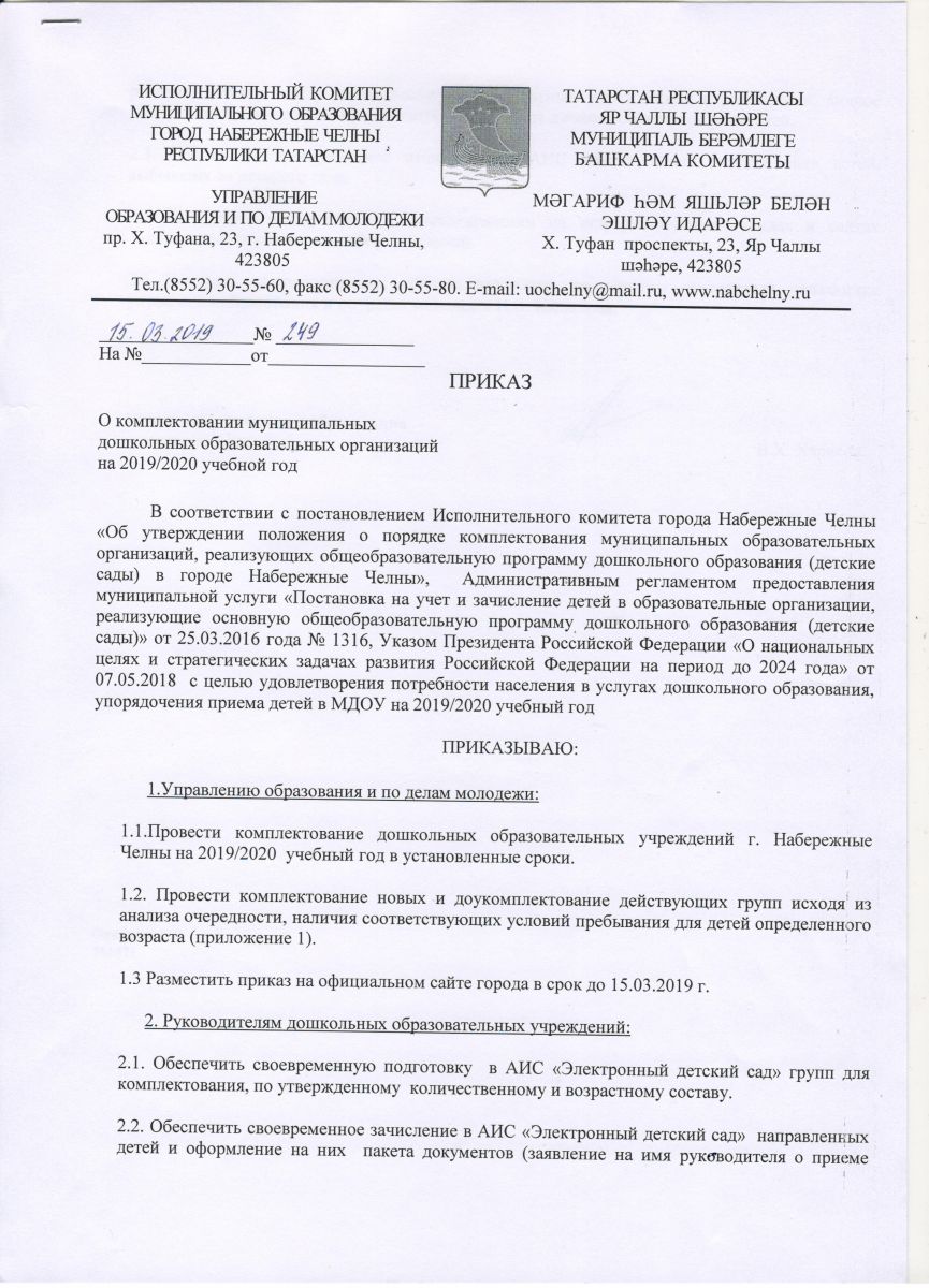 Уважаемые родители! С Приказом №249 от 15.03.2019 "О комплектовании муниципальных дошкольных образовательных организаций на 2019/2020" вы можете ознакомиться, кликнув на «читать новость»