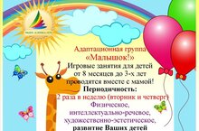 В саду после каникул возобновились игровые занятия для детей от 8 месяцев до 3 лет. Занятия проводятся вместе с мамами с периодичностью 2 раза в неделю по вторникам и четвергам. Занятия по физическому, интеллектуально-речевому и художественному-эстетическому развитию проводят квалифицированные педагоги ДОУ. Стоимость: 4 занятия в неделю - 400 руб., 16 занятий в неделю - 1600 руб., первое занятие бесплатно.