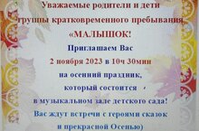 Уважаемые родители! Разбавим осенние будни праздником!!! Приглашаем Вас на осеннее развлечение, в четверг, 2.11.2023. Вас ждёт интереснейшая встреча с героями и подарочки
