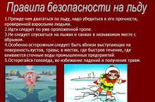 Запрещается выходить на лед, когда его толщина менее 7см; кататься и собираться группами на тонком, еще не окрепшем льду, особенно если он запорошен снегом; в незнакомых местах скатываться на лед с обрывистых берегов; устраивать игры на льду в местах, где есть быстрое течение, где впадают в реки ручейки, образующие промоины; переходить водоемы по льду, где не установлены знаками места безопасного перехода; выходить на лед, если в течение суток резко колеблется температура воздуха, находиться на нем, особенно в темное время суток. Строго следите за детьми! Не пускайте детей без надзора взрослых к реке или водоему во время ледостава. Не оставляйте их на берегу без присмотра. Не оставляйте их на берегу без присмотра. Не разрешайте им кататься на коньках, ходить на лыжах и кататься с крутого берега на неокрепший лед. Строго предупреждайте детей, какой опасности они подвергают себя при переходе по льду водоемов.