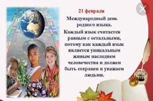 Международный день родного языка отмечается во всем мире 21 февраля. Сберечь язык - очень важная задача. В Республике Татарстан два государственных языка - русский и татарский. Каждый народ - это своя неповторимая культура, традиции, история, и, конечно же, язык. Отмечая международный день родного языка, мы отдаем дань уважения несметному числу существующих в мире языков, культурам, которые они отражают, тому творческому заряду, который придают людям их развитие и формы выражения. Вместе с тем в международный день родного языка все языки признаются равными, поскольку каждый изних уникальным образом отвечает предназначению человека, и каждый представляет живое наследие, которое нам следует оберегать.
