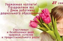 Поздравляем с Днем дошкольного работника! Желаем всегда отличного настроения и бодрости души, постепенного потока положительной энергии и гениальных идей. Успехов Вам в воспитательной деятельности и всех добрых благ для собственной жизни.