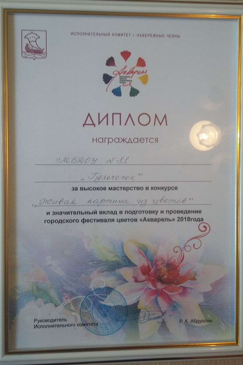 Опубликовано: 30.08.2018Наш детский сад принял участие в конкурсе городского Фестиваля цветов "Акварель -2018". Творческий коллектив педагогов создал Живую картину из цветов под названием "Райский уголок". Коллектив нашего детского сада был награжден дипломом за высокое мастерство.Диплом.jpg