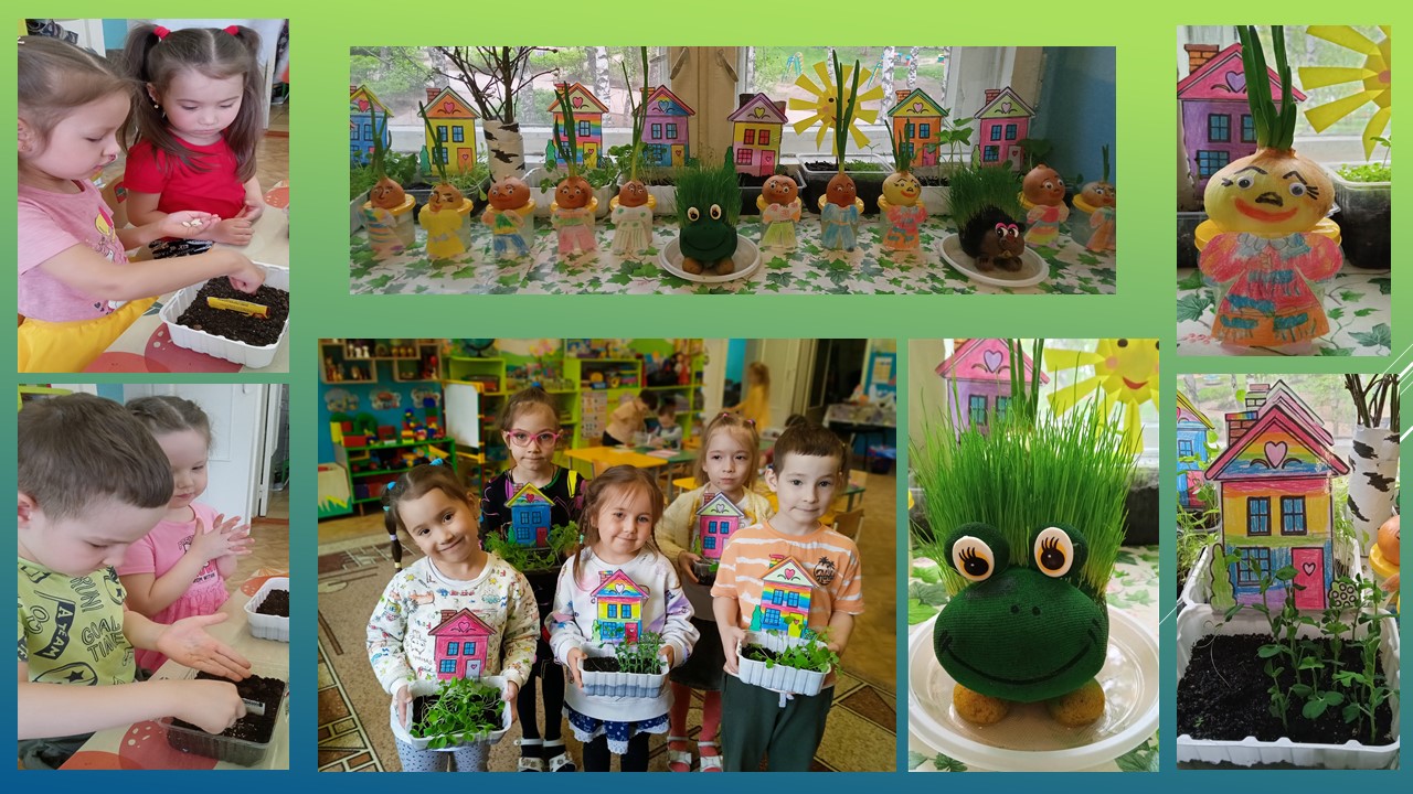 Каждый ребёнок оформил для себя маленькую копию приусадебного участка с грядкой и дачным домиком. И семена высаживались тоже разные, те которые ребята сами выбрали, вместе со своими родителями.