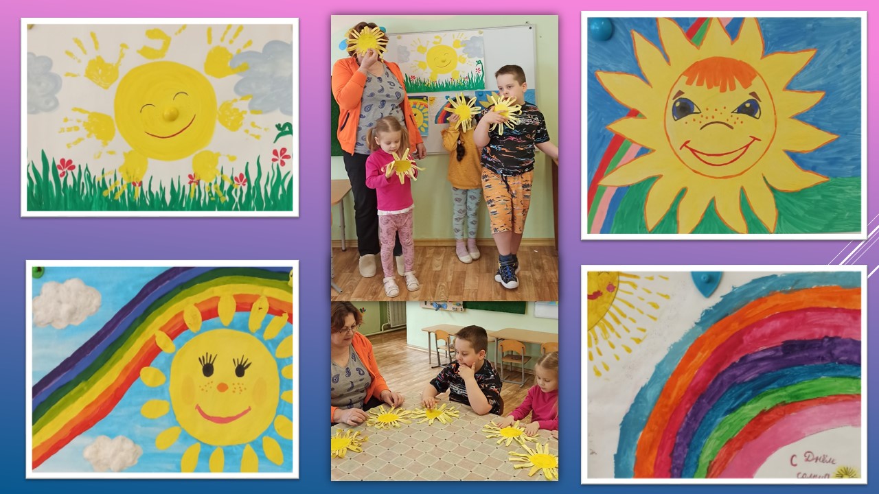 Хотя на улице холодно и пасмурно, но всё же иногда из-за тучек выглядывает солнышко. Утром дети с удовольствием приняли участие в игре "Охота за лучами солнца", где им нужно было найти и поймать "лучики солнца" (солнечные зайчики), которые пускала при помощи зеркальца воспитатель. После игры мы провели увлекательный мастер-класс, где дети делали персональные солнышки. Каждый получил свое собственное солнышко, которое напоминало им о празднике. Долее провели беседу