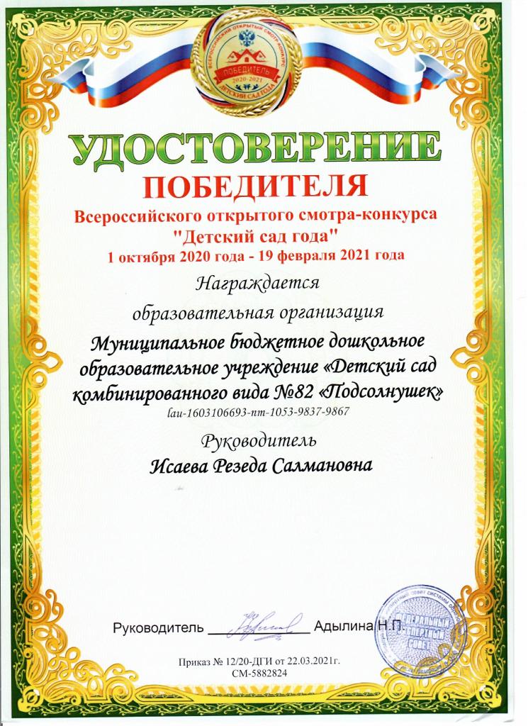 2021 елның 23 мартында "2020-2021 ел балалар бакчасы" Бөтенроссия ачык смотр-конкурсы "ел балалар бакчасы" чарасына йомгак ясалды. Чара кысаларында күпмаксатлы комплекслы анализ нигезендә иң яхшы балалар бакчалары ачыкланды. Безнең бакчабыз җиңүче!