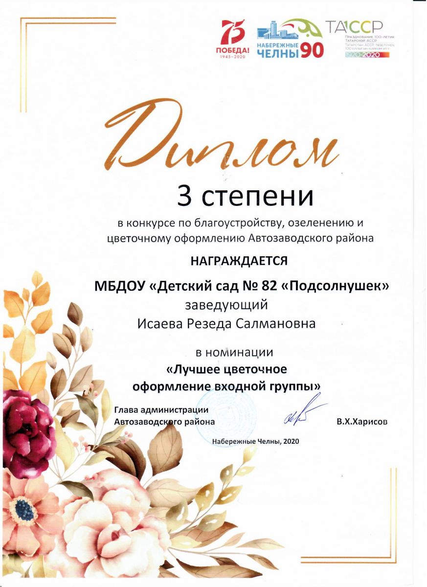 «Туган телдә белем һәм тәрбия бирүне оештыручы иң яхшы балалар бакчасы» республика конкурсы җиңүчесе, диплом.