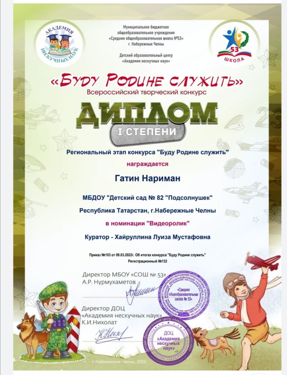 Всероссийский творческий конкурс "Буду Родине служить", диплом первой степени