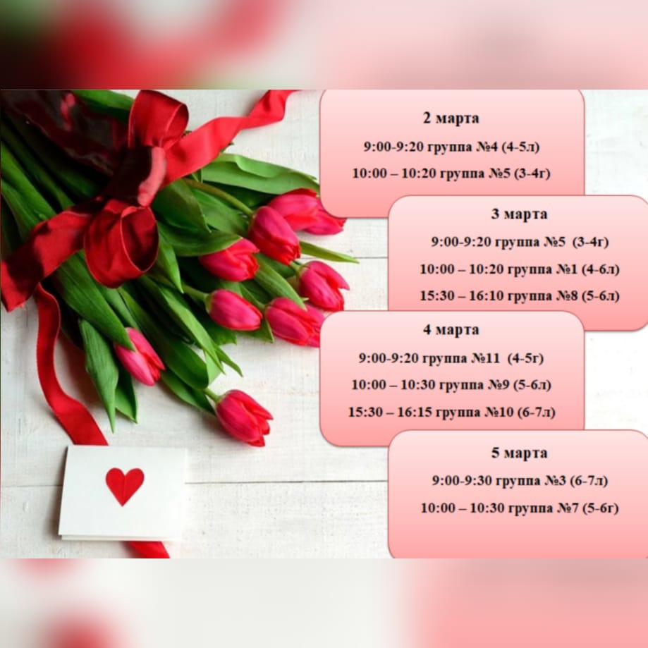 Опубликовано: 27.02.2021Уважаемые родители! Предлагаем вам ознакомится с графиком утренников, посвященных Международному женскому дню.
