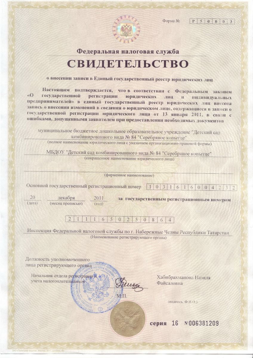 Свидетельство о внесении записи в Единый государственный реестре юридических лиц.