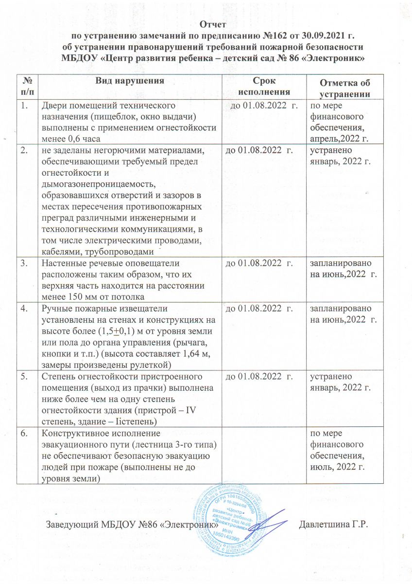 План-отчет устранения замечаний по итогам проверки пожарной безопасности от 30.09.2021 г.