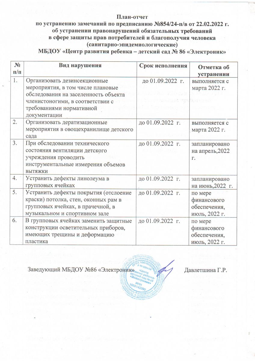 План-отчет устранения замечаний по итогам проверки требований Роспотребнадзора от 22.02.2022 г.