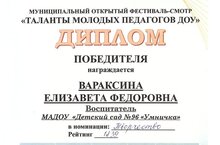 Вараксина Е.Ф. – победитель городского конкурса «Таланты молодых педагогов ДОУ». Воспитатель формирует в детях творческое начало, становится для дошкольников проводником в мир творчества, знаний, открывая перед детьми безграничные горизонты возможностей.Ссылку открывать в браузере Google Chrome здесь https://drive.google.com/file/d/1uHpWVOVQIISi0pb-bneYirUJeXa8P3Gg/view?usp=sharing