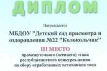 Детский сад награжден Дипломом за 3 место промежуточного ( осенного) этапа республиканского конкурса - акции по сбору отработанных источников тока.