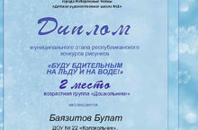 Подведены итоги муниципального этапа республиканского конкурса "Буду бдительным на льду и на воде". Воспитанник группы № 3 Баязитов Булат получил Диплом 2 место за рисунок. Воспитатель Бикутулоа Л.М.