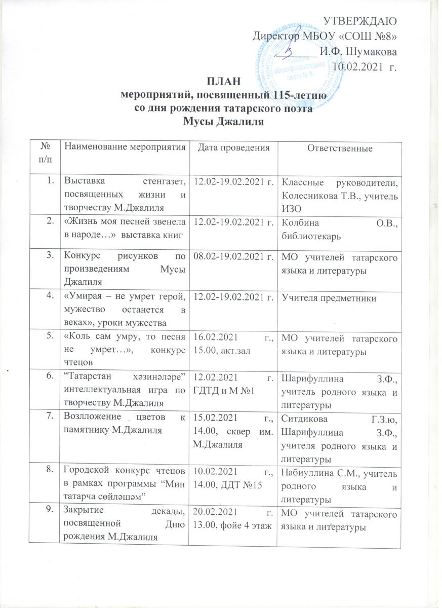 В память героя-поэта проводятся различные мероприятия школьного и городского уровня, в которых учащиеся участвуют с огромным удовольствием. Конкурс рисунков, чтецов, ставшее традицией – возложение цветов к памятнику Мусы Джалиля.