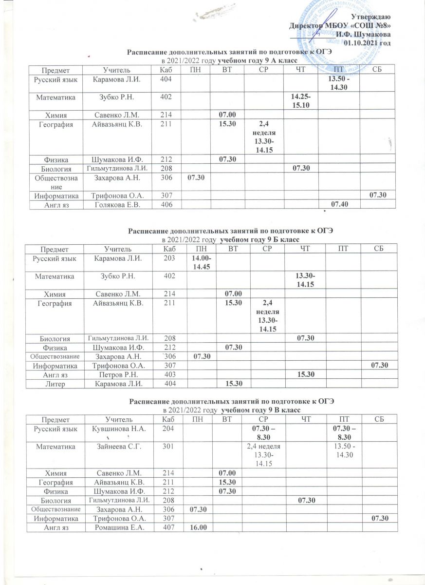 Расписание дополнительных занятий по подготовке к ОГЭ