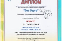 14.04.2022 года инструментальный ансамбль " Малинка" был удостоен диплома 2 степени за участие в муниципальном этапе Республиканского Национального фестиваля детского художественного творчества " Без бергэ" в номинации " Инструментальный ансамбль ". Поздравляем победителей!