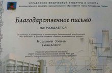 Благодарственным письмом награжден учитель физической культуры ГБОУ "Набережночелнинская школа №67" Кашапов Э.Р. за помощь в проведении и организации региональной конференции "Мы вместе" в рамках проекта "Равные возможности детям"