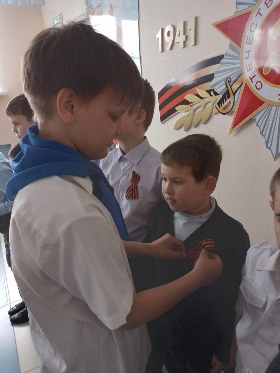 Опубликовано: 25.04.202225.04.2022 года стартовала акция "Георгиевская лента". Тимуровский отряд " Непоседы " вручил ленты обучающимся 1а,1б классов.