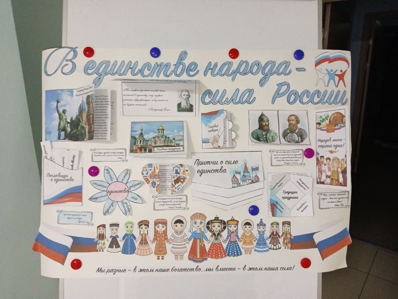 В нашей школе советник директора по воспитанию Е.В.Барламова совместно с обучающимися 8а и 9а классов подготовили стенгазету «В единстве народа – сила России». Библиотекарь Ольга Николаевна Кудимова оформила стенд книг посвященному знаменательной дате.