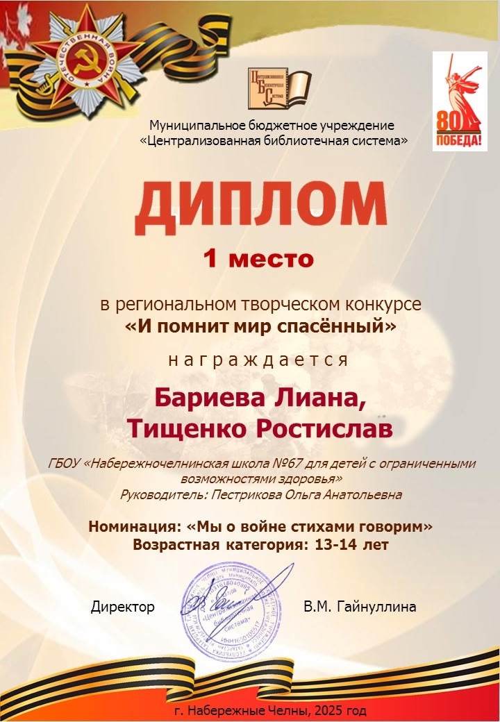 Опубликовано: 17.06.2025Обучающиеся нашей школы Тищенко Ростислав и Бариева Лианы приняли участие в региональном творческом конкурсе " И помнит мир спасенный", посвященном 80-летию Победы в Великой Отечественной войне. Ребята проникновенно прочитали стихотворение Булата Окуджавы "До свидания, мальчики!", составив замечательный поэтический дуэт! По решению жюри номер заслужил почётное 1 место!!! Браво, Лиана и Ростислав! Поздравляем!!!
