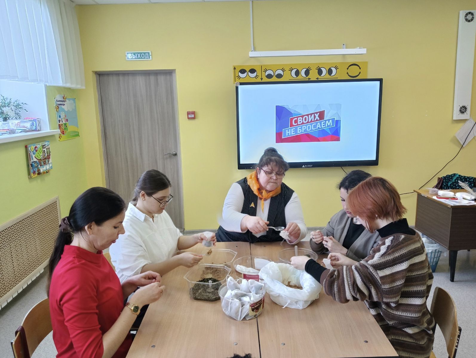 Елена Владимировна провела мастер-класс с мамами по сбору чайных пакетов из трав нашего региона для бойцов в зону СВО.