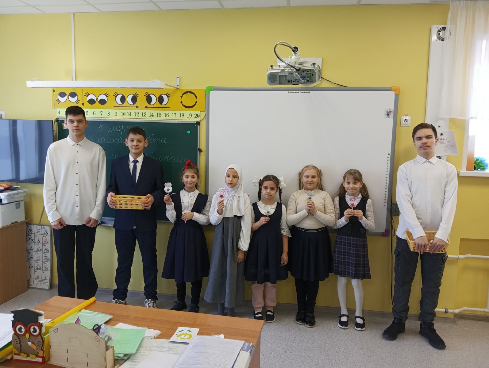 Совместно с советником директора по воспитанию Еленой Владимировной Барламовой обучающиеся 9-х классов красочно оформили хол, встречали учителей поздравительными открытками и музыкальными композициями. Поздравили самых маленьких учениц с наступающим 8 марта, подарив им сладкие подарки. Выпускниками нашей школы записано трогательное видео для своих мам.