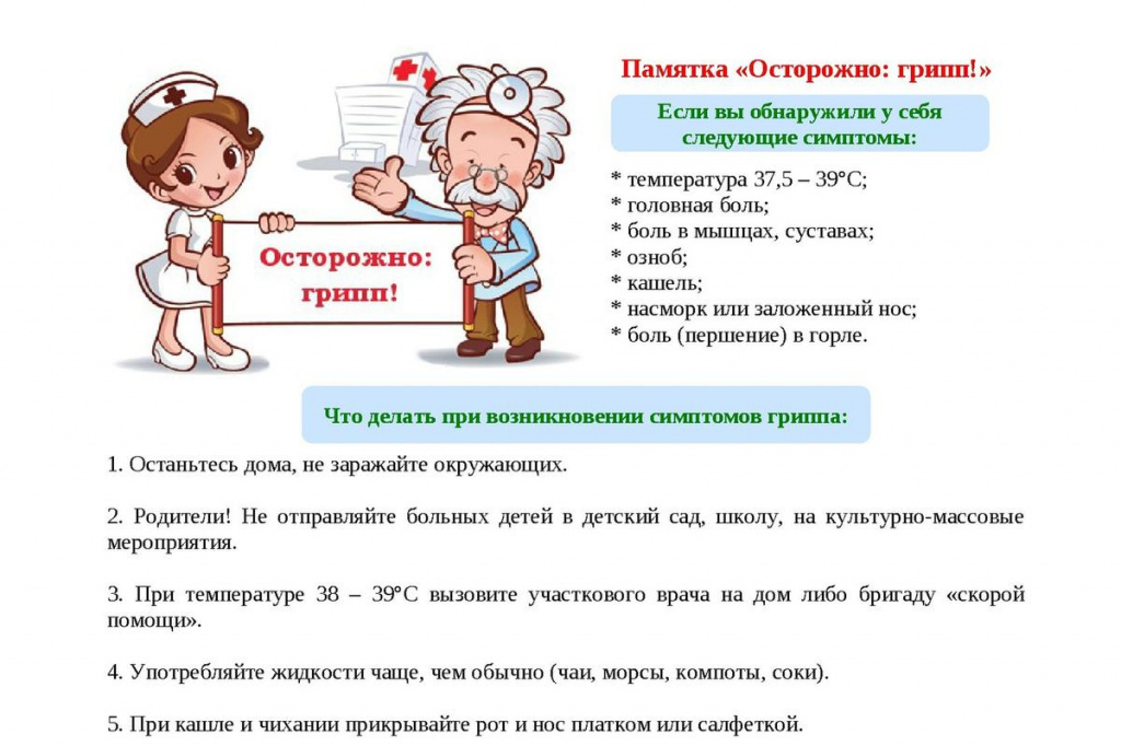 1. Руководителям образовательных учреждений: организовать трансляцию видеоролика (ссылка для скачивания https://www.youtube.com/watch?time_continue=26&v=QhVmdwXINcM&feature=emb_logo) и информационных слайдов по профилактике гриппа и ОРВИ (в приложении) на мониторах, расположенных в общеобразовательных организациях; организовать ежедневный медицинский осмотр и не допускать детей и сотрудников с признаками заболевания острыми респираторными инфекциями в дошкольные и общеобразовательные учреждения. Допускать до занятий детей и персонал только после полного выздоровления; организовать работу медицинских кабинетов в соответствии с требованиями по осмотру детей в условиях вспышечной заболеваемости гриппом и острыми респираторными вирусными инфекциями; обеспечить контроль за регулярным и качественным проведением влажной уборки, обратив особое внимание на поверхности и предметы, которые имели наиболее частые контакты с руками (клавиатуры, парты и т. д.); обеспечить медицинские кабинеты дезинфицирующими средствами и индивидуальными средствами защиты; персоналу карантинных групп обязательное ношение четырехслойных марлевых масок со сменой через каждые 3 – 4 часа; обеспечить трехкратное проветривание помещений, обеззараживание ультрафиолетовыми лучами; удлинить пребывание детей, посещающих группу продленного дня, на свежем воздухе до 4-х часов; принять меры по использованию различных приемов и форм по предупреждению гриппа и острых респираторных заболеваний (применение пропитанных салфеток, чесночных амулетов, использование лучных салатов в меню, проведение влажных уборок,