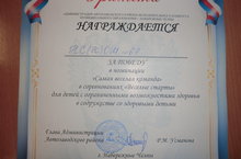 Команда школы награждена грамотой за победу в номинации "Самая весёлая команда" в городских соревнованиях "Весёлые старты" для детей с ОВЗ в содружестве со здоровыми детьми.