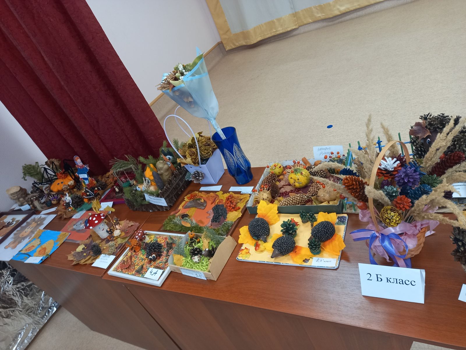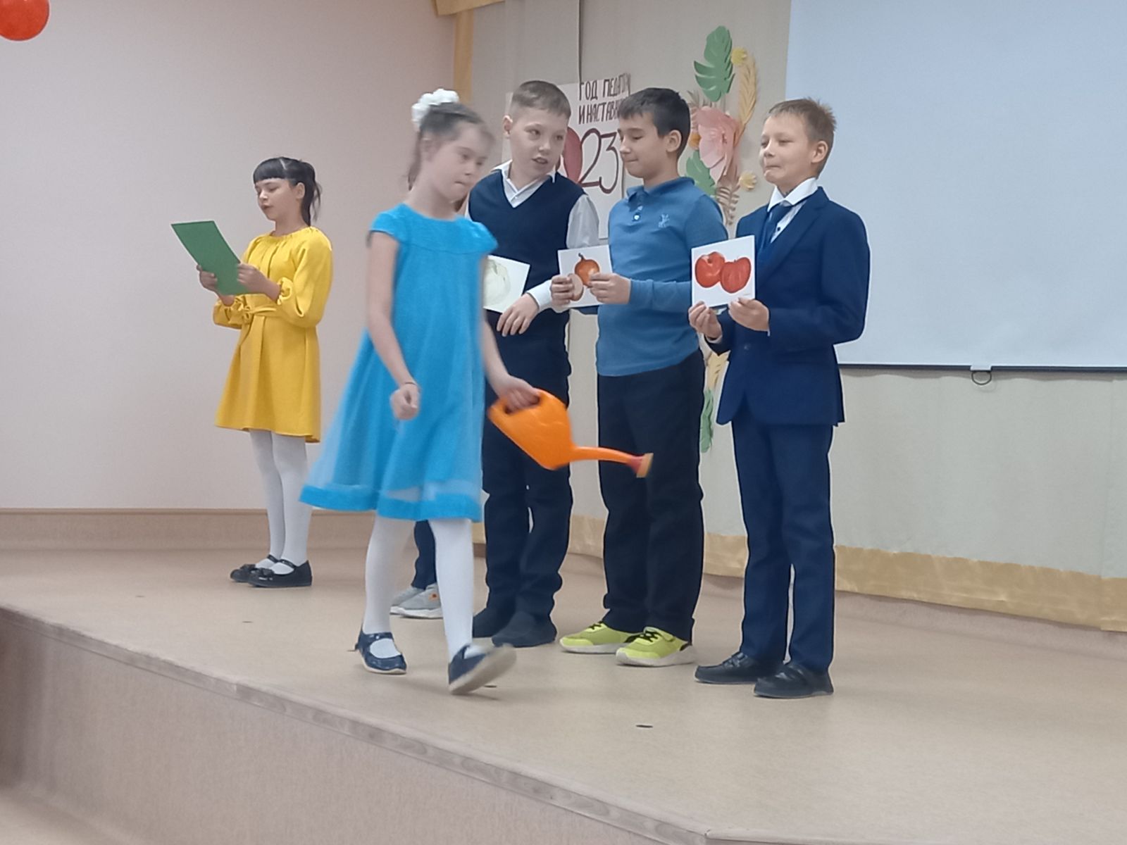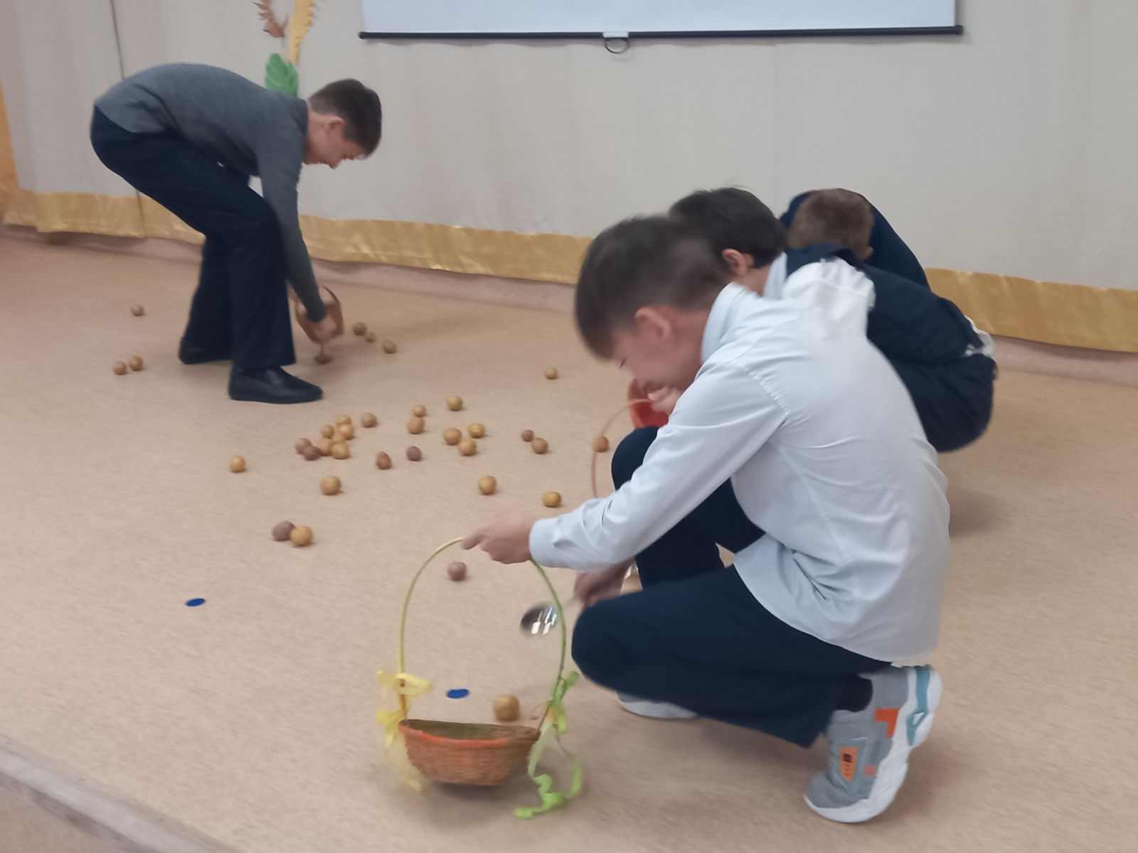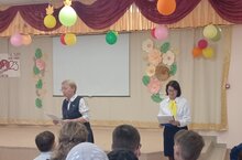 Сегодня в нашей школе очень весело и интересно прошел праздник «Осень золотая в гости к нам пришла!» для учащихся начальной школы. В течение недели дети активно готовились к празднику: учили песни, стихи, готовили сценки, изготовляли поделки из природного материала. Была оформлена выставка творческих работ «Осень золотая в гости к нам пришла» с поделками из природного материала. Так же, дети играли в разные игры, принимали участие в конкурсах: отгадывали фрукты и овощи по форме, по запаху, собирали листья, картофель и т.д.