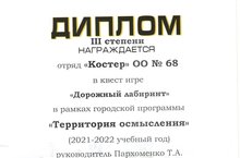 Отряд "Костер" школы 68 награжден диплом III степени за III место в квест-игре "Дорожный лабиринт" в рамках городской программы "Территория осмысления". Руководитель отряда Пархоменко Т.А.