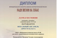 Вокальный ансамбль "Просто класс" награжден Дипломом Лауреата III степени муниципального конкурса военно-патриотической песни "Ради жзизни на Земле". Руководитель ансамбля Матвеева Т.А.