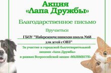 Школа № 68 награждена Благодарственным письмом за участие в городской благотворительной акции "Лапа дружбы" в рамках Всероссийской акции "МЫ ВМЕСТЕ"