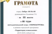 Отряд "Зебра" школы №68 награжден дипломом 3 степени за 3 место в 3 туре интеллектуальной игры "#Перезагрузка" в рамках городской программы "Территория осмысления"