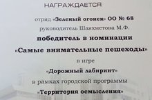 Учащиеся школы, в составе команд "Зебра" и "Зеленый огонек", приняли участие в городской интеллектуальной игре "Территория осмысления", которая проходила в течение учебного года в ДЮЦ №14 и были награждены дипломом за победу в номинации "Самые внимательные пешеходы"