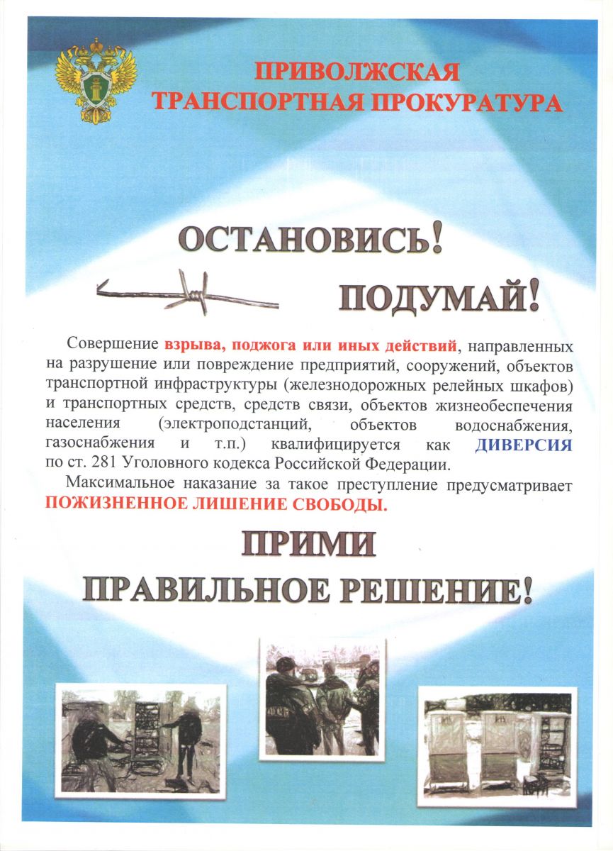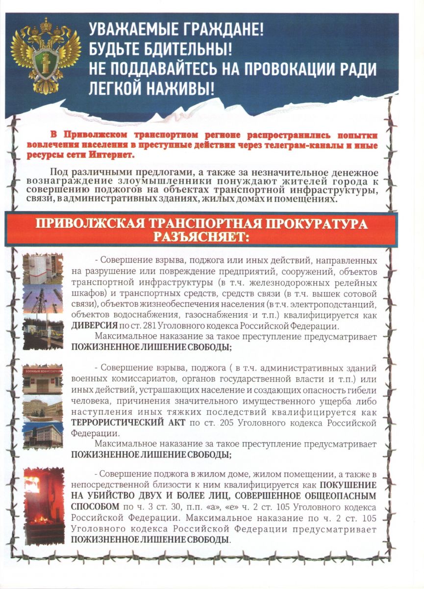 На территории Российской Федерации участились случаи поджогов на объектах транспорта и общественных зданий. В целях предупреждения совершения таких преступлений Приволжской транспортной прокуратурой разработан буклет с разъяснениями об ответственности за совершение диверсий и террористических актов