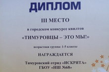 Тимуровский отряд "Искрята" награжден дипломом за III место в городском конкурсе квилтов "Тимуровцы-это МЫ!"