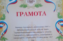 Педагоги школы Серегина Н.А. и Гайфутдинова Р.Г. награждены грамотой "ООО ЖЭУ 51" за организацию и хорошую работу с детьми в июне месяце 2017г.