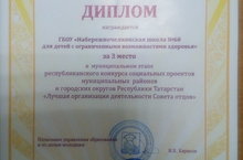 ГБОУ "Набережночелнинская школа № 68 для детей с ОВЗ" награждена дипломом за 3 место в муниципальном этапе республиканского конкурса социальных проектов муниципальных районов и городских округов Республики Татарстан "Лучшая организация деятельности Совета отцов"