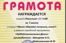 В рамках городской программы "SamoSтоятельные Дети" отряд "Позитив" за проведенную Акцию "Яркая здоровая зимушка-зима" получил грамоту за 1 место на мунициальном уровне. Руководители: Шакурова А.Х., Шайхигалиева Ф.М.