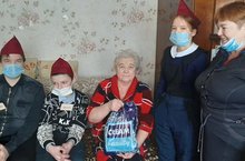Тимуровский отряд "Дружба" в рамках месячника по патриотическому воспитанию молодёжи поздравили Ветерана Тыла ВОВ Фаттахову Назиру Гайнановну с праздником "День защитника Отечества".