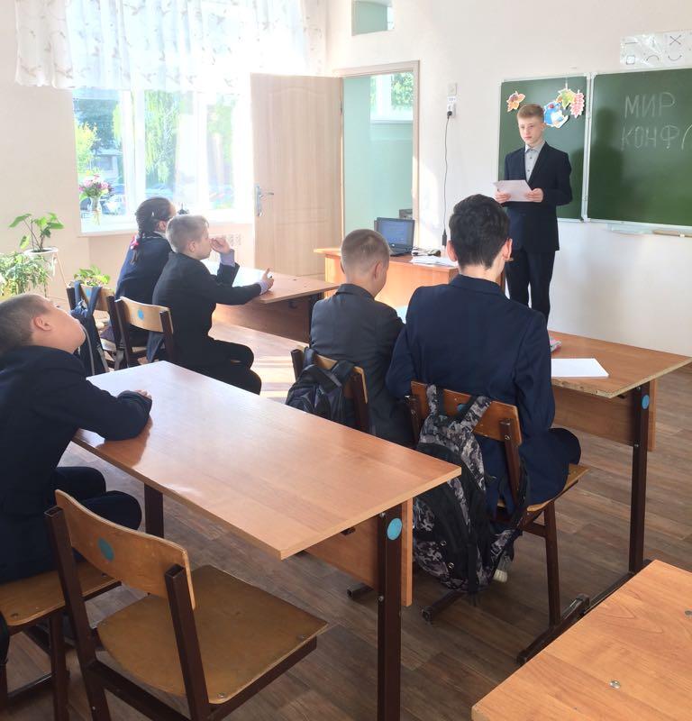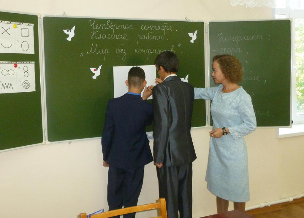 Согласно воспитательному плану мероприятий 04.09.2018г. в 6-9 классах ГБОУ «Набережночелнинская школа №69» был проведён Единый классный час по теме «Мир без конфликтов». Цели и задачи данного мероприятия: формулировка понятия «конфликт»; создание условий для понимания амбивалентного смысла конфликта (отрицательного и положительного); актуализация личного опыта участников, связанного с использованием различных стилей поведения в конфликте, на модели игровой ситуации; самоанализ стилей поведения в конфликте; обучение способам выхода из конфликтной ситуации. Ребята посмотрели презентацию по данной теме и приняли активное участие в беседе и в различных играх и тренинговых упражнениях.