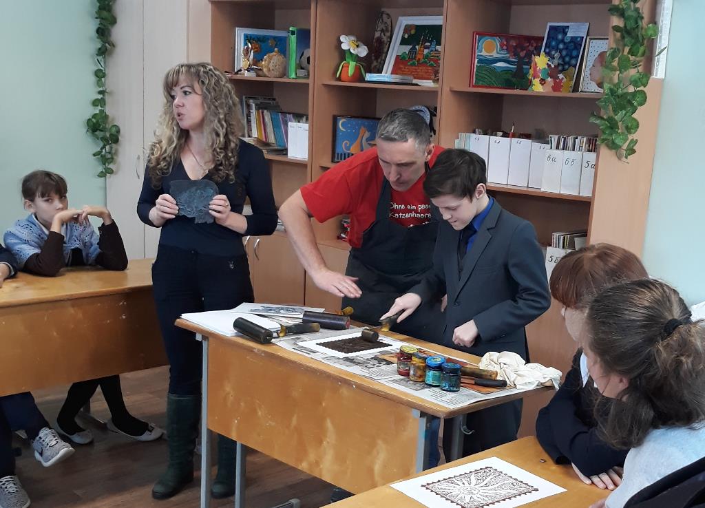 29 ноября 2018 года в рамках декады инвалиды для учащихся 5-9 классов сотрудниками картинной галереи Хабировой Региной Марсовной, Мингалеевым Маратом Искандаровичем был проведен благотворительный мастер-класс по печатной графике. Учащиеся познакомились с новым для себя направлением, узнали много интересного. С помощью сотрудников картинной галереи учащиеся наносили типографскую краску на гравюру, затем переносили ее на бумагу. Рисунок получался необычайно ярким и фактурным. Все участники остались довольны данным мероприятием.